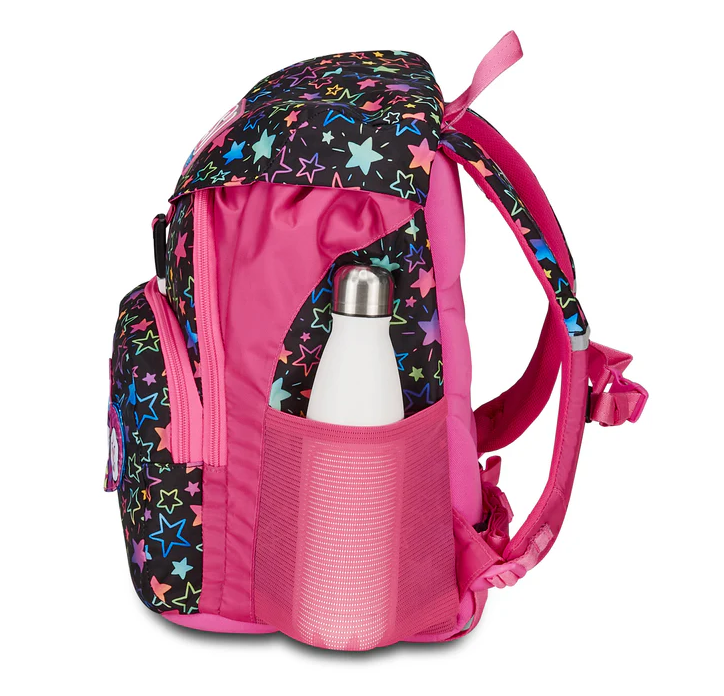 Single-compartment backpack with double front pocket. Separate water bottle pocket.