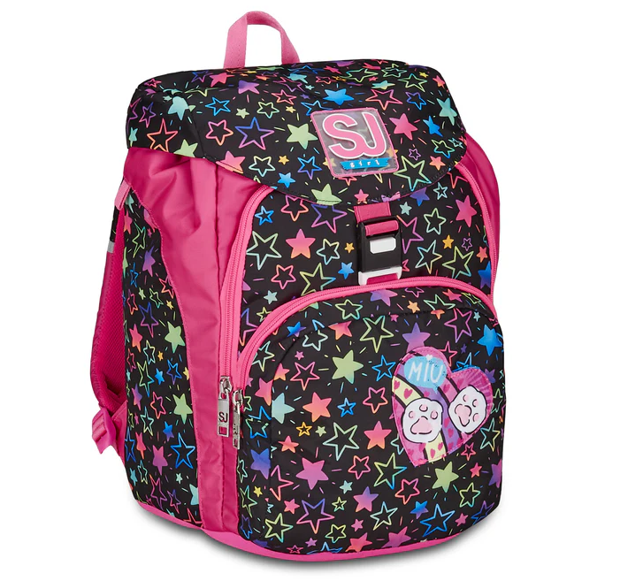 Magnetic buckle opening. Load compression system to bring the contents of the backpack closer to the back. Preformed bottom with feet. Flip System.